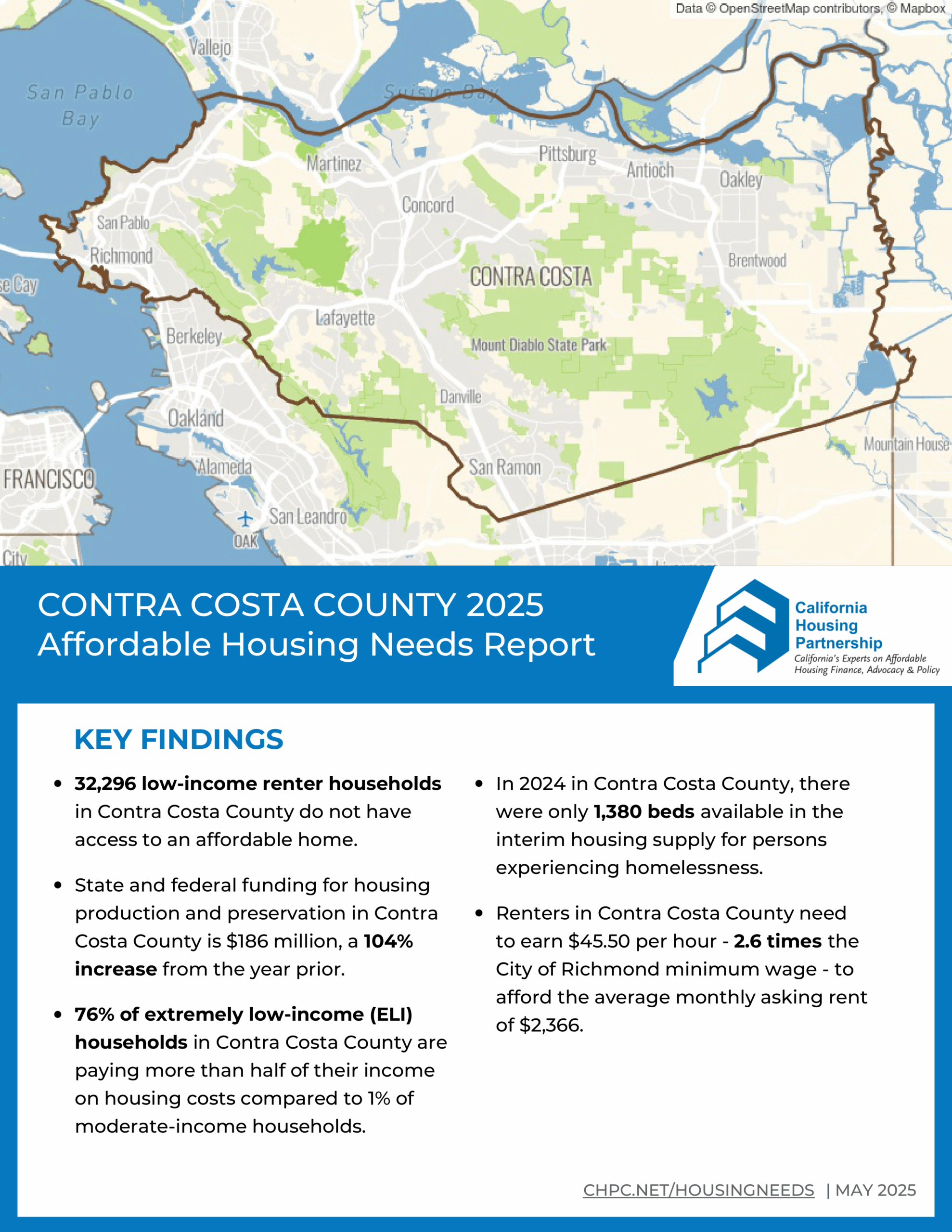 The 2025 Affordable Housing Need Report highlights market conditions in Contra Costa County and key indicators of housing need for low-income families, including: levels of housing production, state and federal funding, asking rent trends, and local wages.